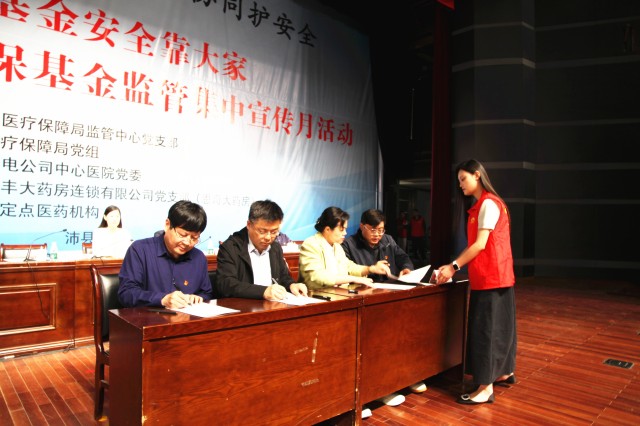 4月25日上午,徐州市醫療保障局監管中心黨支部、沛縣醫療保障局黨組、江蘇益豐大藥房連鎖有限公司黨支部聯(lián)合大屯煤電中心醫院黨委,在大屯公司俱樂(lè )部聯(lián)合開(kāi)展“醫?;鸢踩看蠹摇秉h建共建暨醫?;鸨O管集中宣傳月活動(dòng)。市醫保局監管中心李巋處長(cháng)、沛縣常務(wù)副縣長(cháng)趙蓉、大屯煤電中心醫院黨委書(shū)記張心海及恩奇大藥房總經(jīng)理丁力等人出席活動(dòng)??h醫保局黨委書(shū)記、局長(cháng)張婧主持會(huì )議,沛縣各醫療機構共300余人參加活動(dòng)。