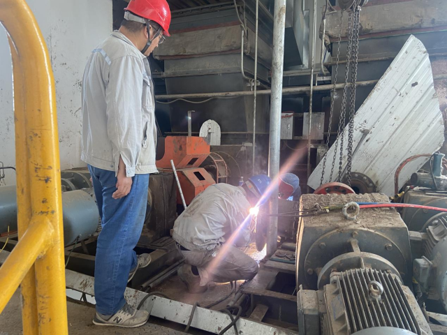 豐縣全新世可再生能源有限公司檢修人員搶修給料螺旋軸承法蘭,保障五一期間機組正常運行。
