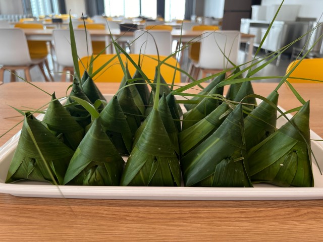 活動(dòng)伊始,隨著(zhù)主持人一聲令下,來(lái)自不同部門(mén)和單位組成的參賽小組迅速投入“戰斗”。食堂大廚與包粽能手示范 “包粽秘籍”,粽葉在大家手中靈活翻飛,糯米、紅棗等食材巧妙搭配,轉眼間,一個(gè)個(gè)造型別致的粽子整齊排列。賽場(chǎng)上,加油聲、歡笑聲此起彼伏,大家比速度、拼創(chuàng )意,三角粽棱角分明,四角粽圓潤飽滿(mǎn)。最終,評委們從數量、外觀(guān)、創(chuàng )意等維度綜合評選出前8名優(yōu)秀選手。