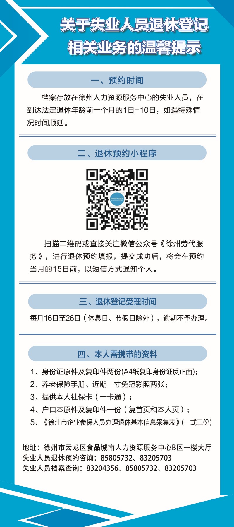 3月1日,勞代公司全新改版的退休預約登記微信公眾號“勞代服務(wù)”正式上線(xiàn)。自3月1日起,凡符合以下兩個(gè)條件的退休人員,只需在到達法定退休年齡前一個(gè)月的10日內,關(guān)注微信公眾號“勞代服務(wù)”,即可辦理預約登記:(1)檔案存放在徐州市人力資源服務(wù)中心的失業(yè)人員;(2)未參…