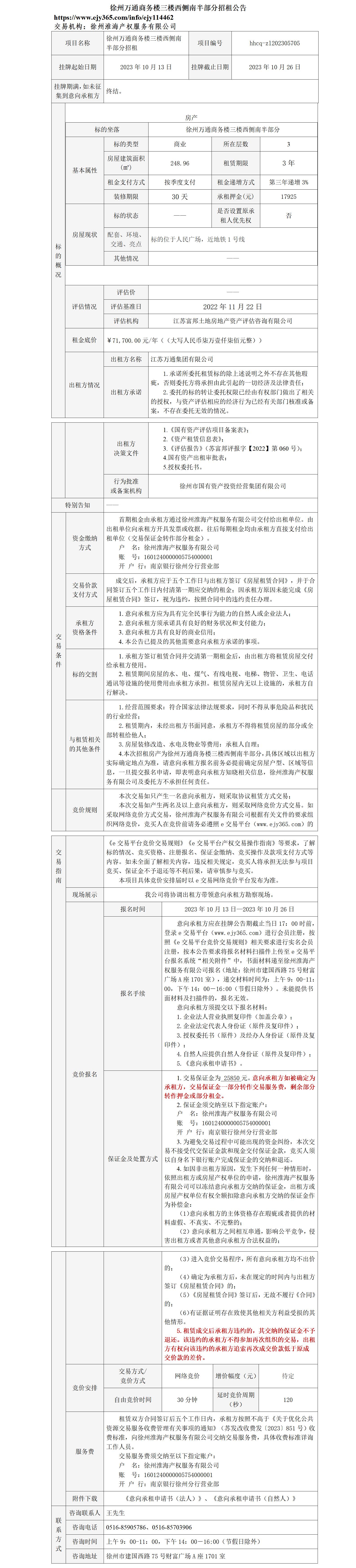徐州萬(wàn)通商務(wù)樓三樓西側南半部分招租公告