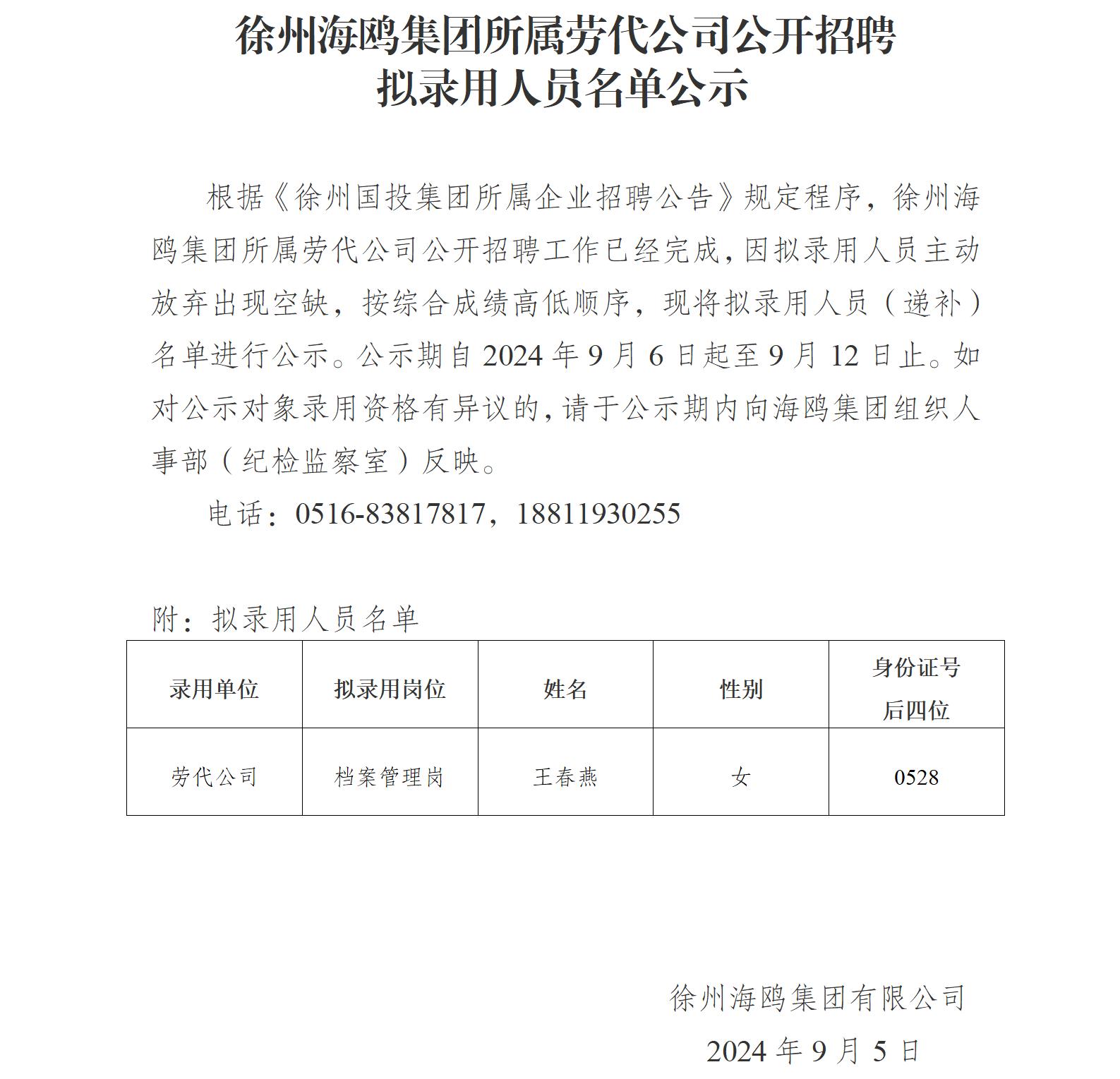 徐州海鷗集團所屬勞代公司公開(kāi)招聘擬錄用人員名單公示