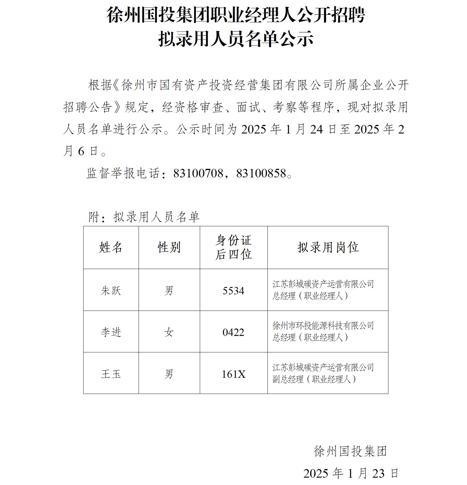 徐州國投集團職業(yè)經(jīng)理人公開(kāi)招聘擬錄用人員名單公示