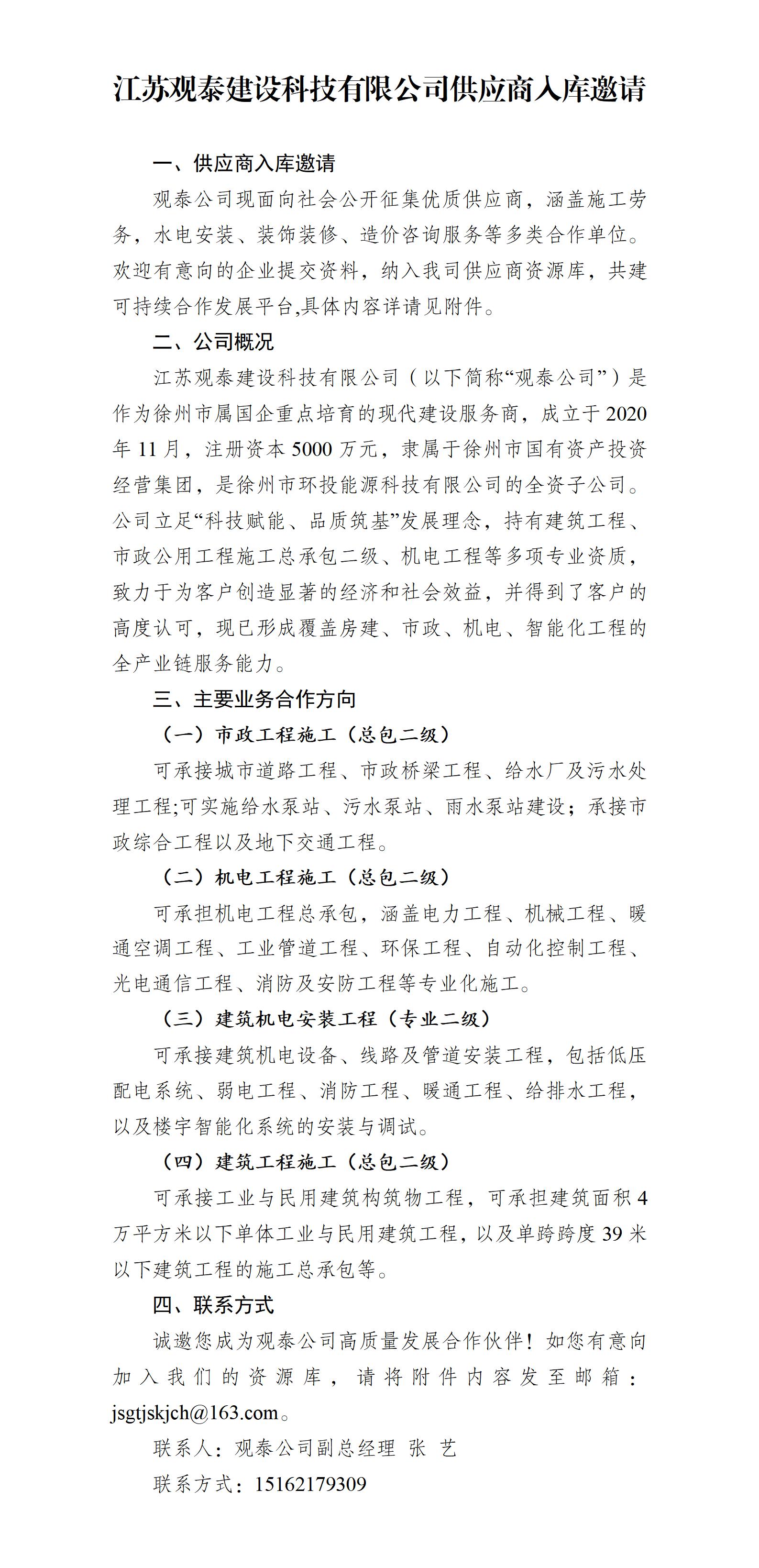 江蘇觀(guān)泰建設科技有限公司供應商入庫邀請