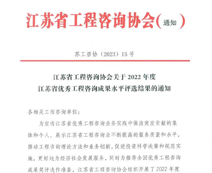 為展示江蘇省工程咨詢(xún)業(yè)服務(wù)質(zhì)量和水平,宣傳表彰在江蘇省優(yōu)秀工程咨詢(xún)業(yè)務(wù)實(shí)踐中做出突出貢獻的集體和個(gè)人,近日,江蘇省工程咨詢(xún)協(xié)會(huì )組織開(kāi)展了2022年度江蘇省優(yōu)秀工程咨詢(xún)成果水平評選工作。集團公司所屬工程咨詢(xún)中心共有5項咨詢(xún)成果獲獎,其中一等水平2項,二等水平1項,三…