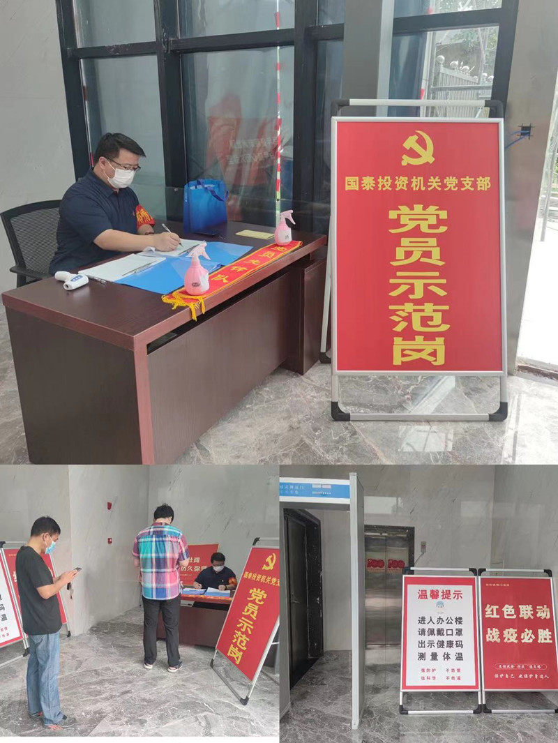 國泰投資公司在此次疫情防控中,獨立設置員工出入口,并在出入口設置疫情防控監測點(diǎn),每天早上由“先鋒隊”黨員輪值,督促正確佩戴口罩,查看“兩碼”,測量體溫等,構筑群防群治的嚴密防線(xiàn)。8月9日一早,黨總支書(shū)記霍凱同志以身作責,作為先鋒隊第一個(gè)正式“上崗”的黨員走上防控監測服務(wù)第一線(xiàn)?!?