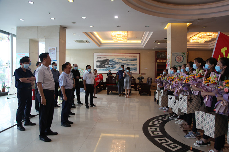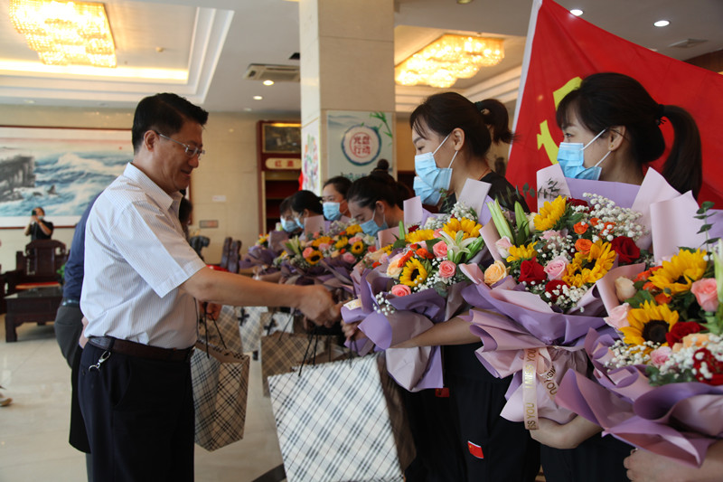 27日早上8點(diǎn),12名抗疫隊員們穿著(zhù)貼有國旗標識的統一服裝,高舉著(zhù)鮮紅的黨旗,懷著(zhù)激動(dòng)的心情列隊等候在大廳,李曉東董事長(cháng)、姜巖總經(jīng)理與她們一一親切握手、問(wèn)候,親手送上鮮花與禮盒,并與她們合影留念。