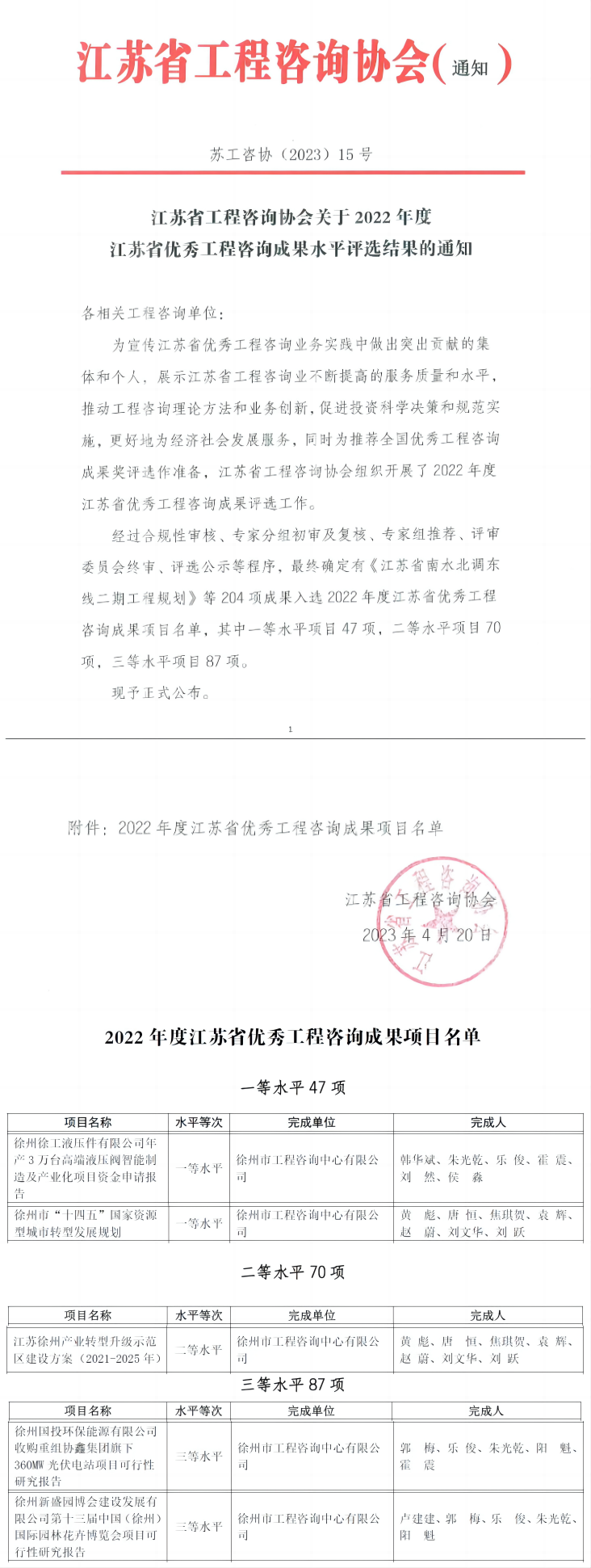 為展示江蘇省工程咨詢(xún)業(yè)服務(wù)質(zhì)量和水平,宣傳表彰在江蘇省優(yōu)秀工程咨詢(xún)業(yè)務(wù)實(shí)踐中做出突出貢獻的集體和個(gè)人,近日,江蘇省工程咨詢(xún)協(xié)會(huì )組織開(kāi)展了2022年度江蘇省優(yōu)秀工程咨詢(xún)成果水平評選工作。集團公司所屬工程咨詢(xún)中心共有5項咨詢(xún)成果獲獎,其中一等水平2項,二等水平1項,三等水平2項。