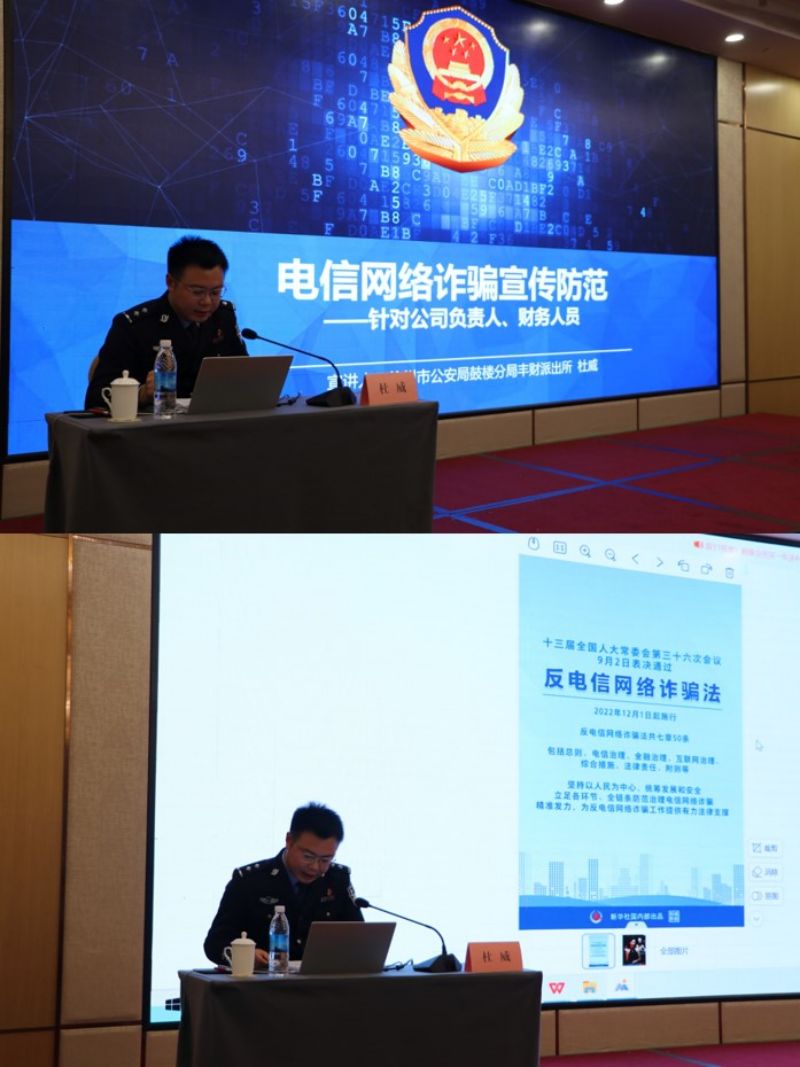 國泰投資公司以“無(wú)詐企業(yè)”創(chuàng )建活動(dòng)為牽引,邀請徐州市公安局鼓樓分局豐財派出所杜所長(cháng)擔任主講人,開(kāi)展了一期“電信網(wǎng)絡(luò )詐騙防范宣傳”專(zhuān)題培訓。杜所長(cháng)以近期頻發(fā)的電信網(wǎng)絡(luò )詐騙真實(shí)案件為例,為員工深入剖析電信詐騙的基本類(lèi)型、話(huà)術(shù)特點(diǎn)、基本流程以及防范措施,用“以案釋法”的方式講解了冒充客服詐騙、AI科技詐騙、刷單詐騙、公檢法詐騙等常見(jiàn)手段,從不同角度為員工講授防騙知識,同時(shí)也向員工普及了《網(wǎng)絡(luò )安全法》《反電信詐騙法》《個(gè)人信息保護法》等相關(guān)的法律法規知識。