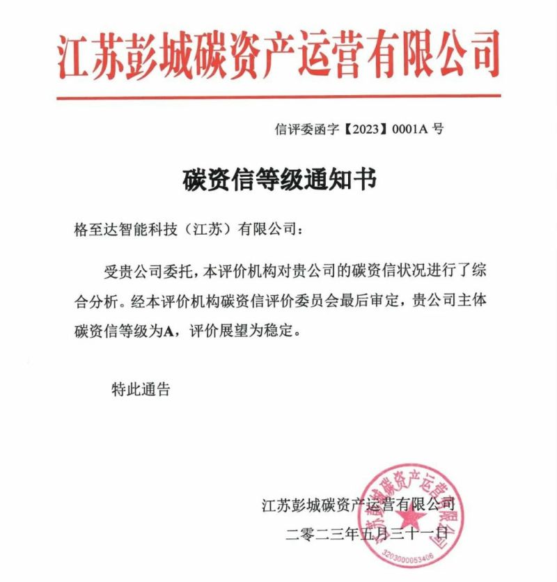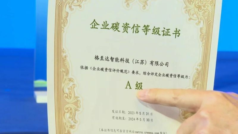 12月8日,在江蘇省新型能源體系示范啟動(dòng)暨徐州市綠色低碳能源產(chǎn)業(yè)發(fā)展推進(jìn)大會(huì )上,江蘇銀行徐州分行、格雷博智能動(dòng)力、徐州國投集團共同簽署了格至達綠色貸款項目,簽署完走下臺的格至達智能科技(江蘇)有限公司副總經(jīng)理鄧昇,迫不及待地向記者展示了全市首張企業(yè)碳資信等級證書(shū),“0001A”號!