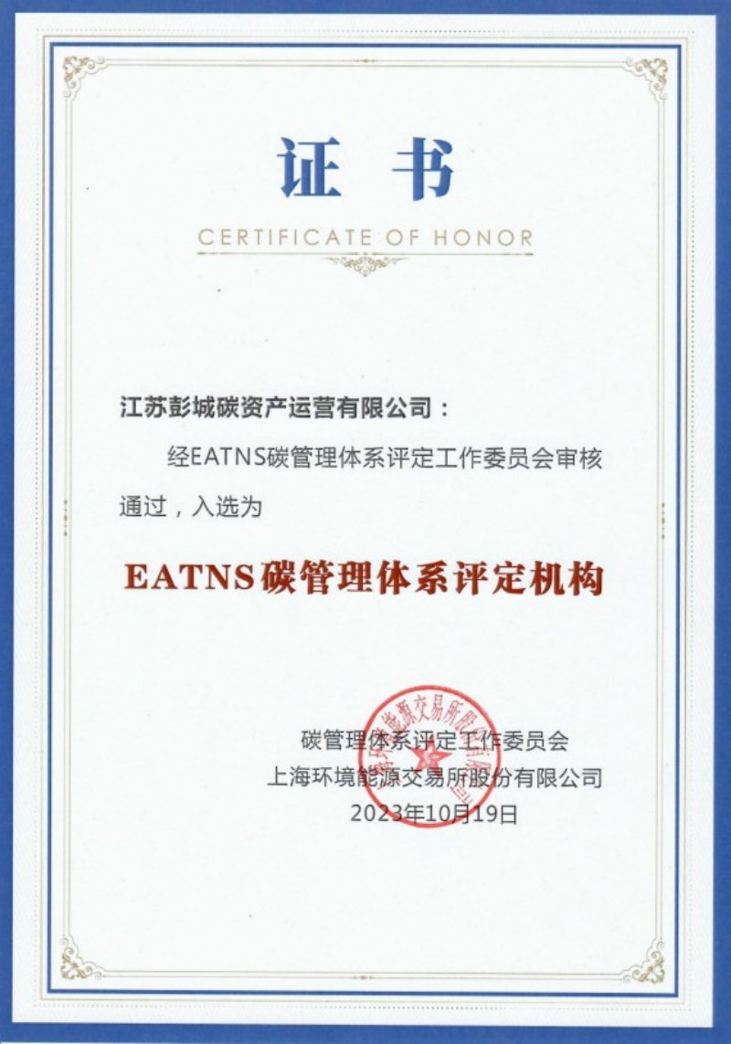 今年10月,江蘇彭城碳資產(chǎn)運營(yíng)有限公司經(jīng)EATNS碳管理體系評定工作委員會(huì )審核通過(guò),入選EATNS碳管理體系評定機構,這是全國能開(kāi)展碳資信評價(jià)的九家團隊之一。