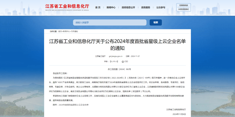 近日,江蘇省工業(yè)和信息化廳發(fā)布2024年度首批省星級上云企業(yè)名單,經(jīng)企業(yè)申報、各地推薦、專(zhuān)家評價(jià)、信用審查、專(zhuān)題會(huì )審等程序,國新公司入選首批五星級上云企業(yè),標志著(zhù)國新公司在強化工業(yè)互聯(lián)網(wǎng)平臺建設、推進(jìn)數字化轉型和提升智能化制造水平等方面取得了顯著(zhù)成效,在信息化建設方面邁上新的臺階。