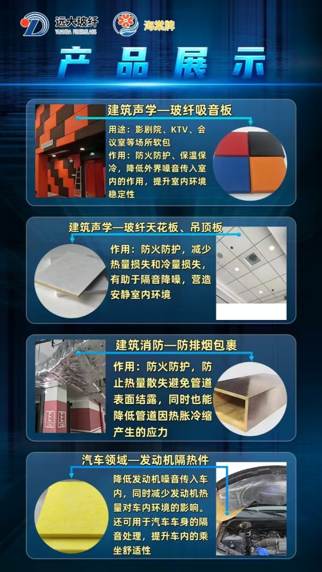 玻璃棉、玻璃棉板、玻璃棉卷氈、高溫玻璃棉卷氈、帶鋁箔玻璃棉板、帶鋁箔玻璃棉卷氈、汽車(chē)內飾專(zhuān)用玻璃棉、樓地面隔聲板、無(wú)甲醛棕色玻璃棉(板)、無(wú)甲醛白色玻璃棉(板)、防排煙道專(zhuān)用包裹材料等、防排煙風(fēng)管、玻璃棉管殼。