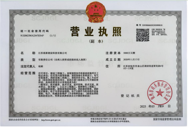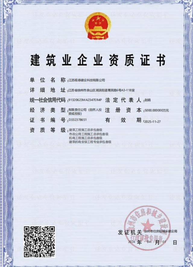 江蘇觀(guān)泰建設科技有限公司(以下簡(jiǎn)稱(chēng)“觀(guān)泰公司”)是作為徐州市屬?lài)笾攸c(diǎn)培育的現代建設服務(wù)商,成立于2020年11月,注冊資本5000萬(wàn)元,隸屬于徐州市國有資產(chǎn)投資經(jīng)營(yíng)集團,是徐州市環(huán)投能源科技有限公司的全資子公司。公司立足“科技賦能、品質(zhì)筑基”發(fā)展理念,持有建筑工程、市政公用工程施工總承包三級、機電工程等多項專(zhuān)業(yè)資質(zhì),致力于為客戶(hù)創(chuàng )造顯著(zhù)的經(jīng)濟和社會(huì )效益,并得到了客戶(hù)的高度認可,現已形成覆蓋房建、市政、機電、智能化工程的全產(chǎn)業(yè)鏈服務(wù)能力。