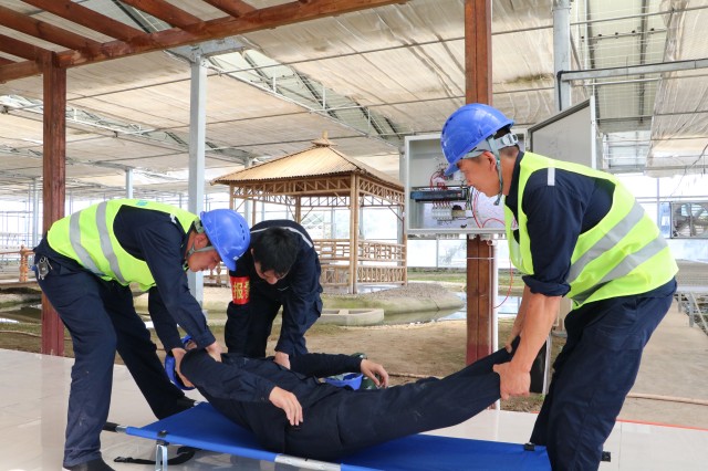 14時(shí)35分,刺耳的警報劃破寧靜,觸電搶救應急演練率先登場(chǎng)。四名電站運維員工組成的應急小組迅疾響應,嚴格按照預案流程行動(dòng)。只見(jiàn)一人果斷切斷電源,另一人利用絕緣桿將“觸電者”安全脫離危險區,其余隊員立即上前進(jìn)行規范的心肺復蘇急救。整個(gè)過(guò)程緊張有序,展現了團隊在突發(fā)險情中的高效協(xié)作與過(guò)硬技能。演練結束,安全專(zhuān)家即時(shí)點(diǎn)評,對脫離電源的技術(shù)要點(diǎn)與心肺復蘇操作標準進(jìn)行強化講解,切實(shí)提升現場(chǎng)人員的應急實(shí)戰能力。