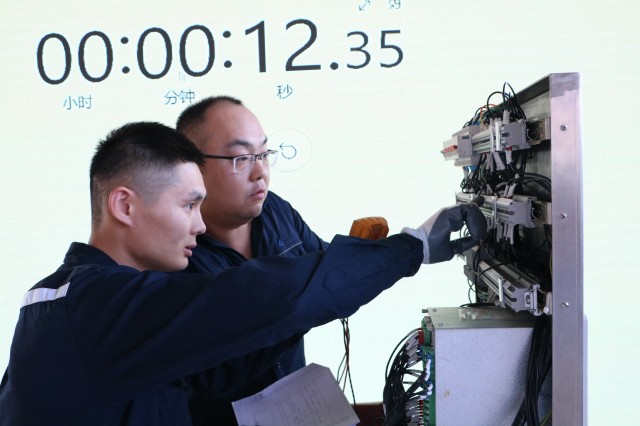 練兵場(chǎng)亦是競技臺。15時(shí)30分,高壓開(kāi)關(guān)柜回路故障消缺實(shí)操比賽開(kāi)始。多支參賽隊伍輪番上陣,在裁判嚴格監督下展開(kāi)較量。面對預設的復雜回路故障,選手們身著(zhù)統一工裝,佩戴齊整防護,審閱圖紙、測試分析、精準排障。每一次舉手示意操作、每一次工具精準落點(diǎn),都體現著(zhù)“安全第一、規范先行”的鐵律。賽場(chǎng)氣氛緊張激烈,選手們沉著(zhù)冷靜的故障診斷能力與嫻熟的動(dòng)手能力贏(yíng)得陣陣贊嘆。