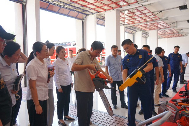 全體人員首先實(shí)地參觀(guān)了消防救援支隊特勤一站的救援車(chē)輛與裝備,消防員詳細講解了各類(lèi)器材的功能與應用場(chǎng)景,展示了快速破拆、水槍射流等實(shí)戰操法,精湛技能和颯爽英姿贏(yíng)得陣陣掌聲。在體驗環(huán)節,青年代表體驗了消防液壓剪切鉗、消防水帶的操作使用。