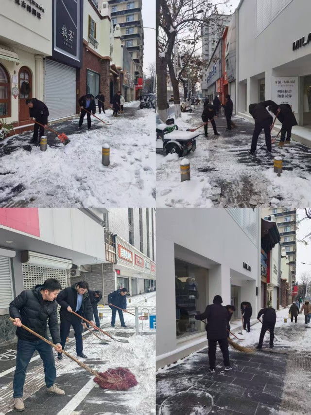 大家不畏嚴寒,手持鐵鍬、掃帚、除雪鏟、融雪劑等工具,分成多個(gè)小組,迅速前往中山路、淮海西路等沿街租賃區域。大家分工明確,配合默契,有的奮力鏟除冰層,有的仔細清掃積雪……在凜冽的寒風(fēng)中,形成了一道堅守奉獻、溫暖人心的風(fēng)景線(xiàn)。經(jīng)過(guò)數小時(shí)的連續奮戰,積雪和堅冰被徹底清除,行人和車(chē)輛通行道路暢通無(wú)阻。這不僅為租戶(hù)們打通了一條安全經(jīng)營(yíng)、高效運營(yíng)的“綠色通道”,也為市民們提供了一條安全出行、舒心暢行之路。